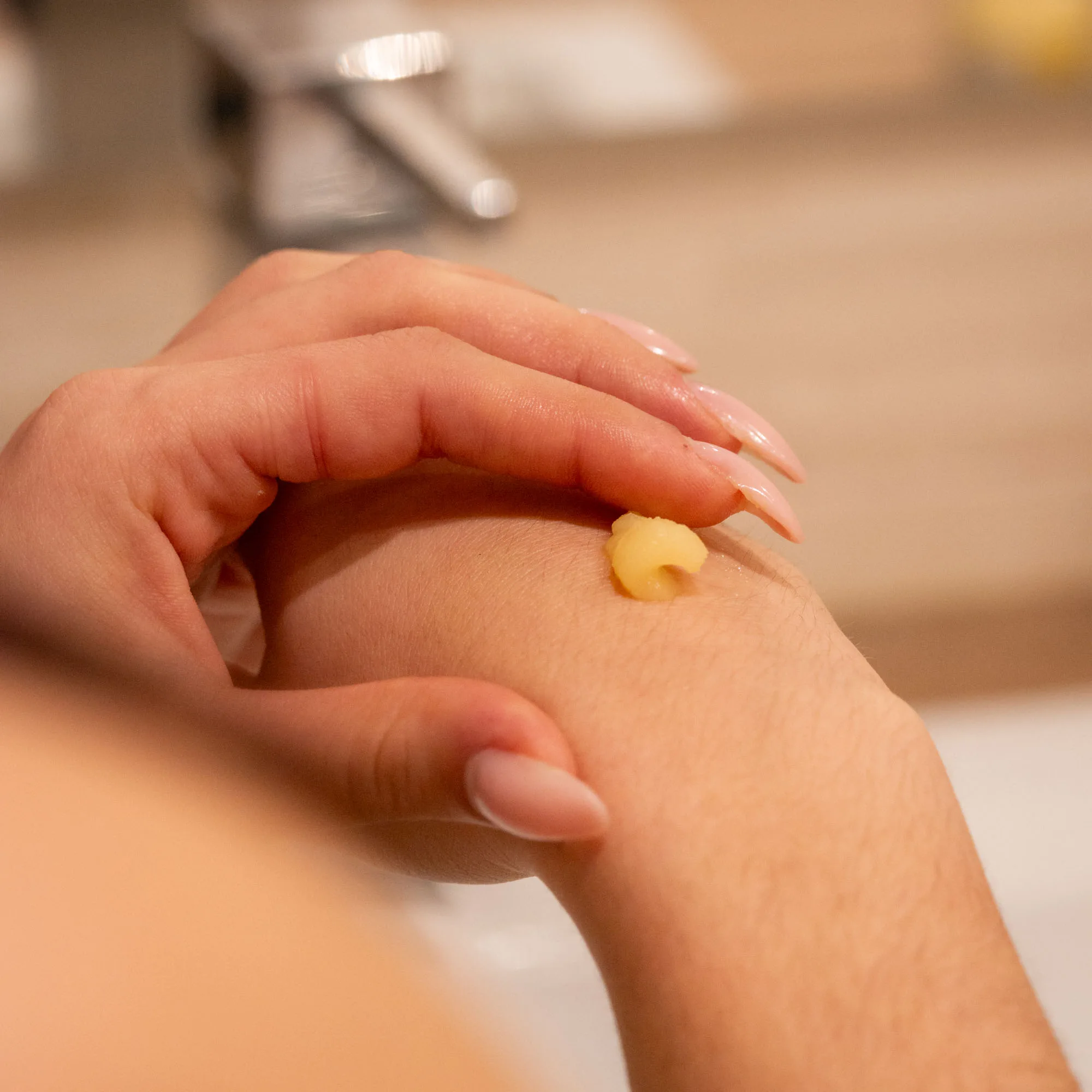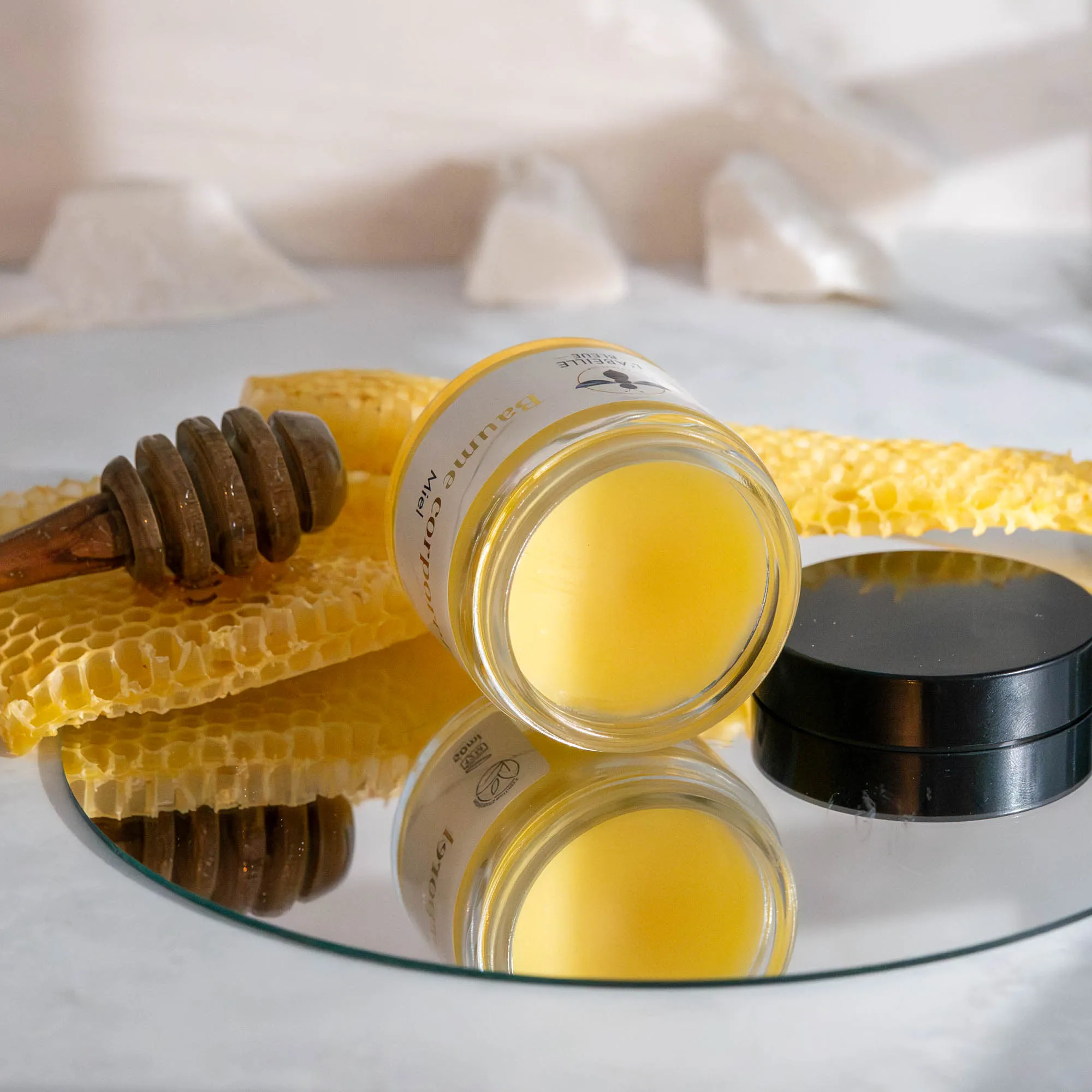 Sa base végétale est constituée d’huile d’amande douce, de beurre végétal, de cire d’abeille, de fécule de maïs, et enrichie en miel issu de nos ruches en Touraine. Ce miel, récolté localement, est intégré dans la formule pour apporter richesse et douceur à la texture. Le parfum ajouté est subtil et léger. Ce produit ne contient aucune huile essentielle, ce qui lui confère un caractère neutre et accessible à tous les publics, sans contre-indication particulière.