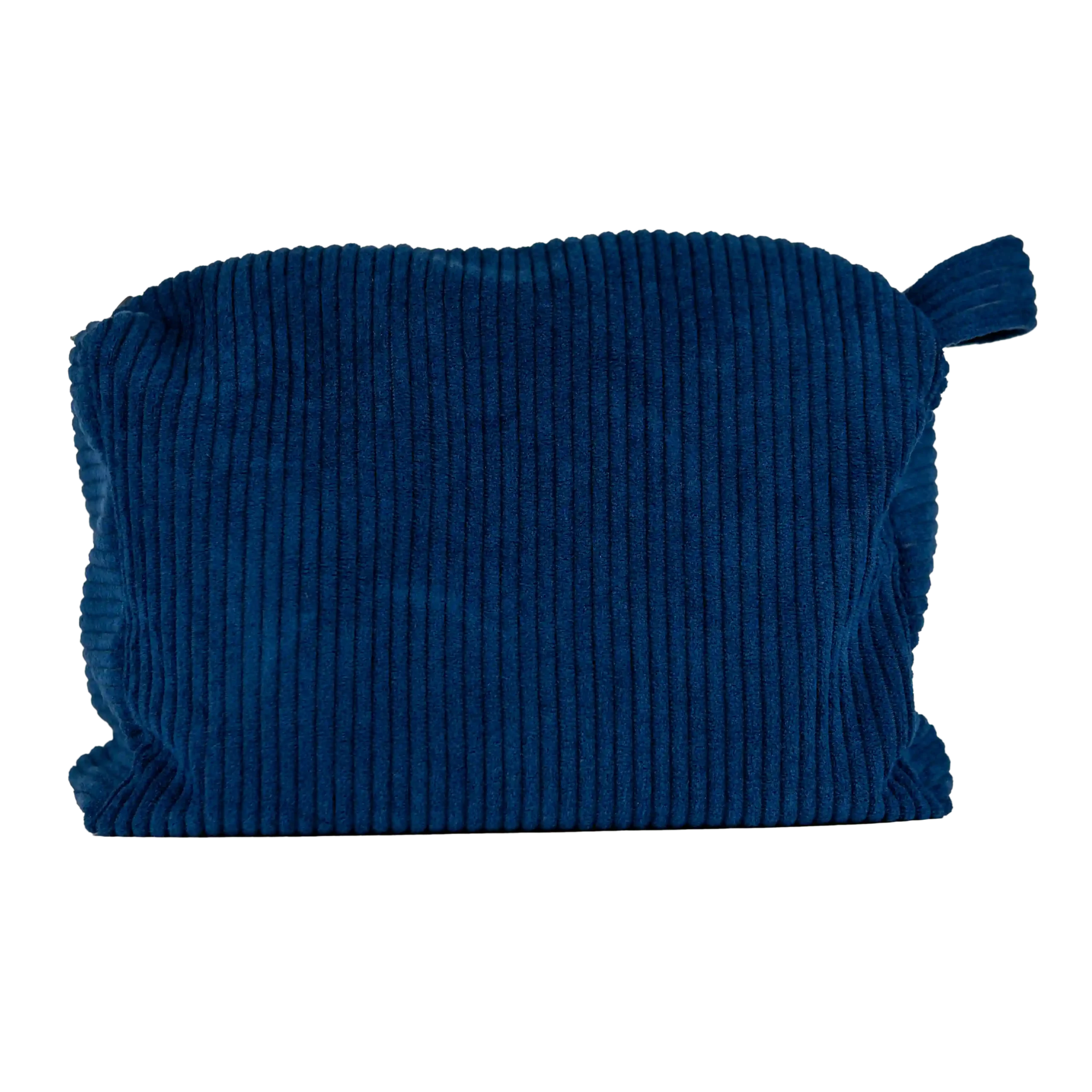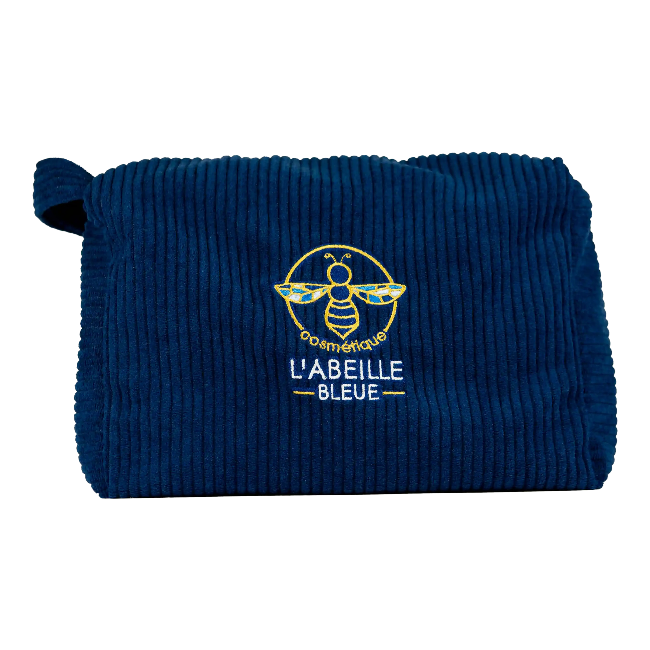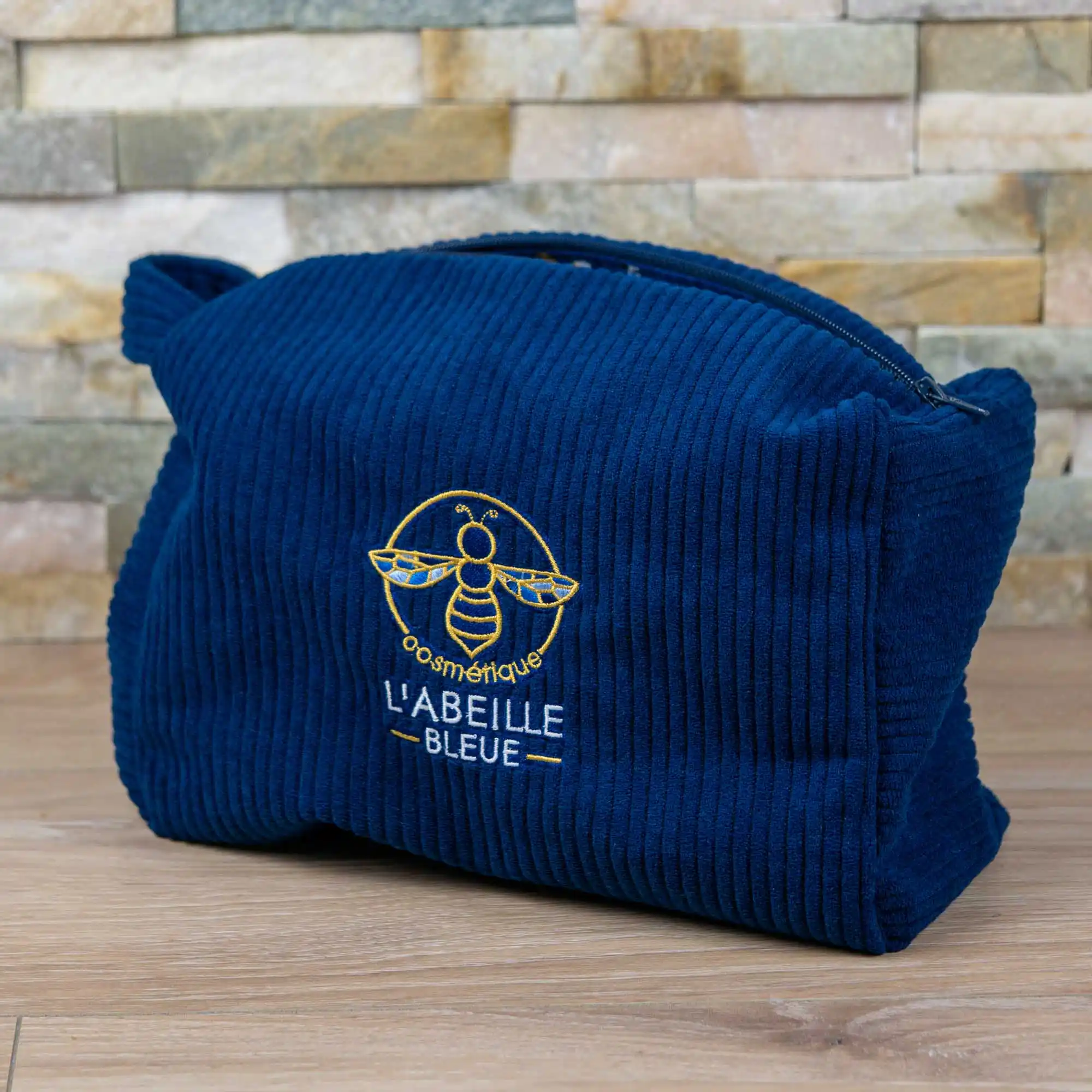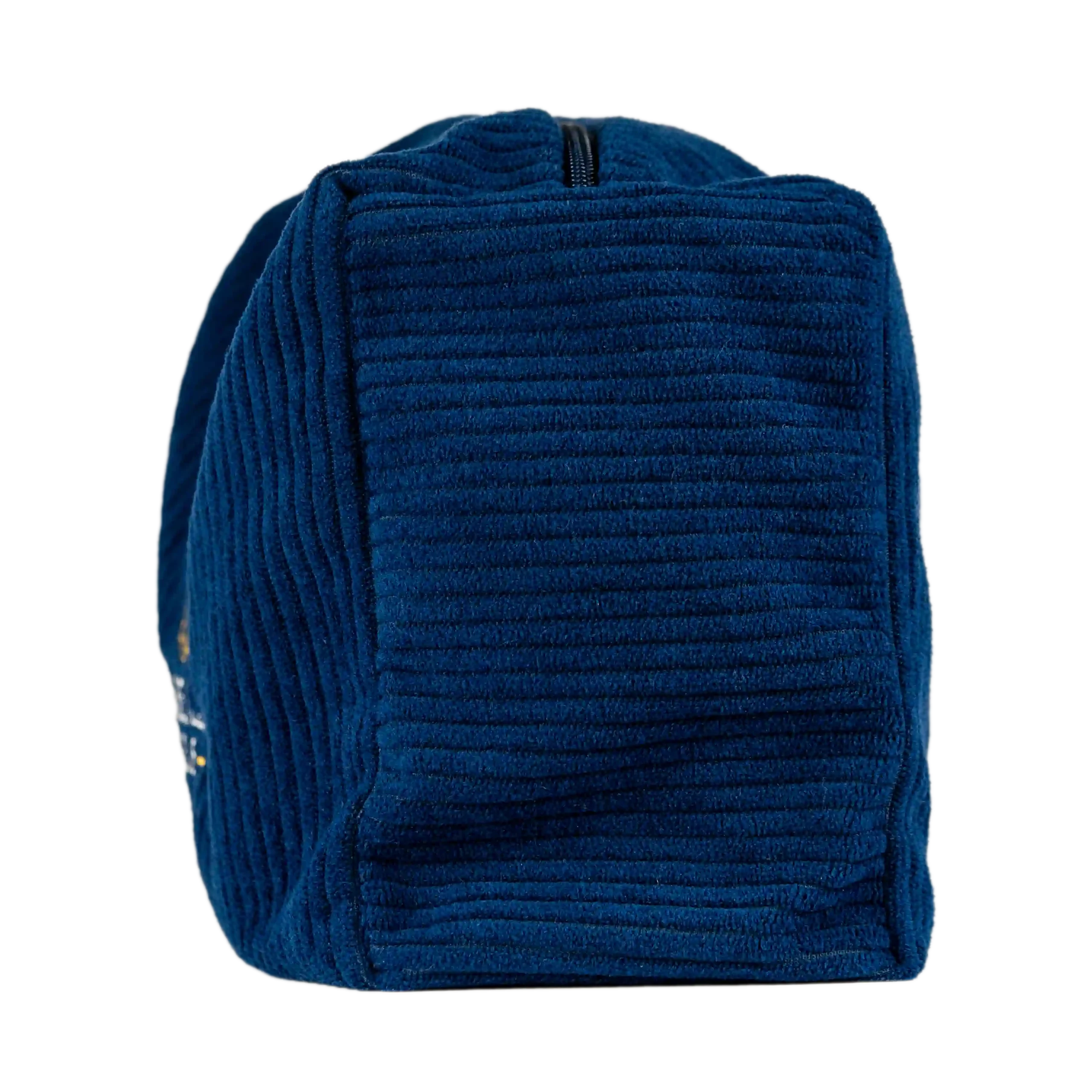 Une trousse de toilette artisanale, confectionnée à la main dans un velours côtelé bleu marine, alliant qualité, élégance et et praticité.