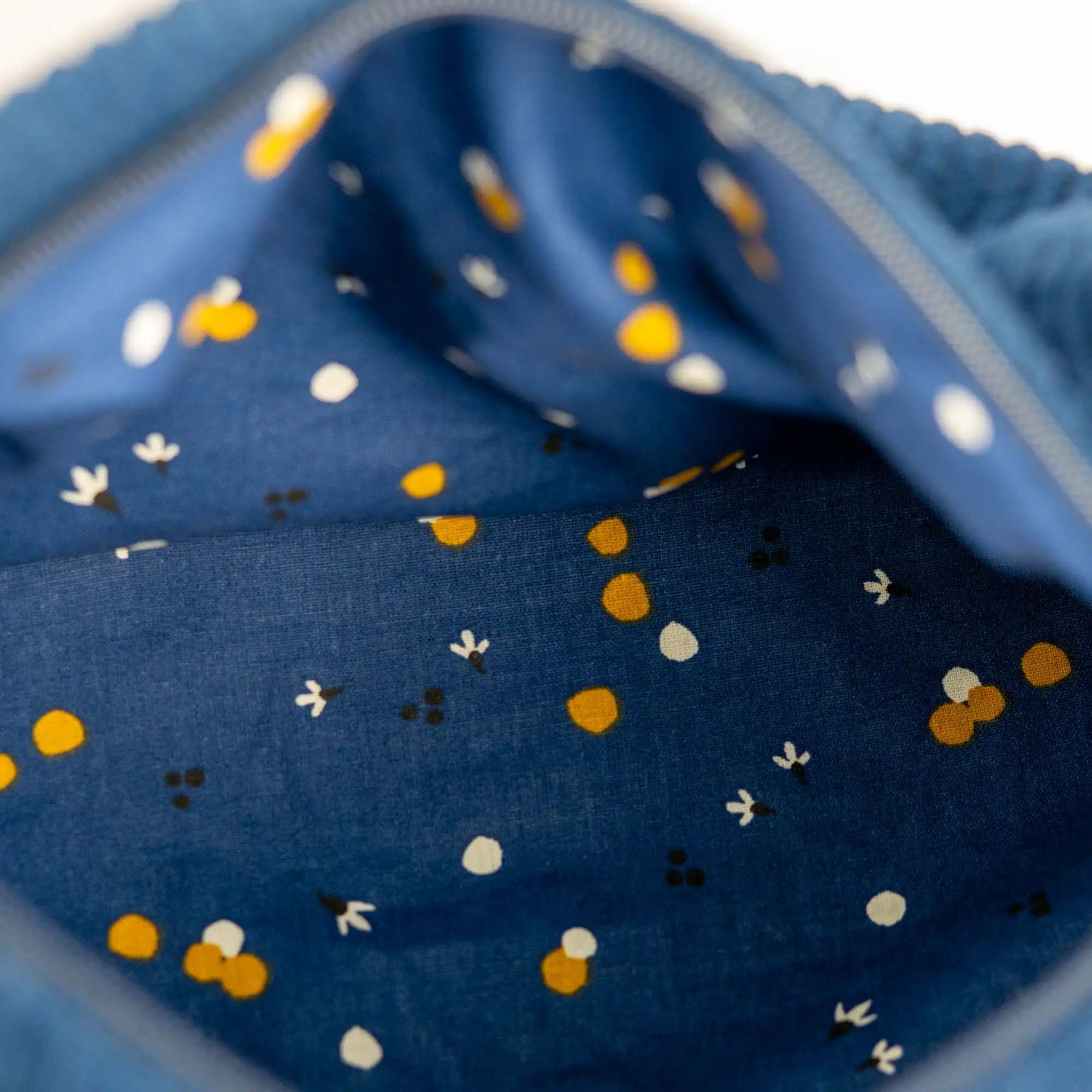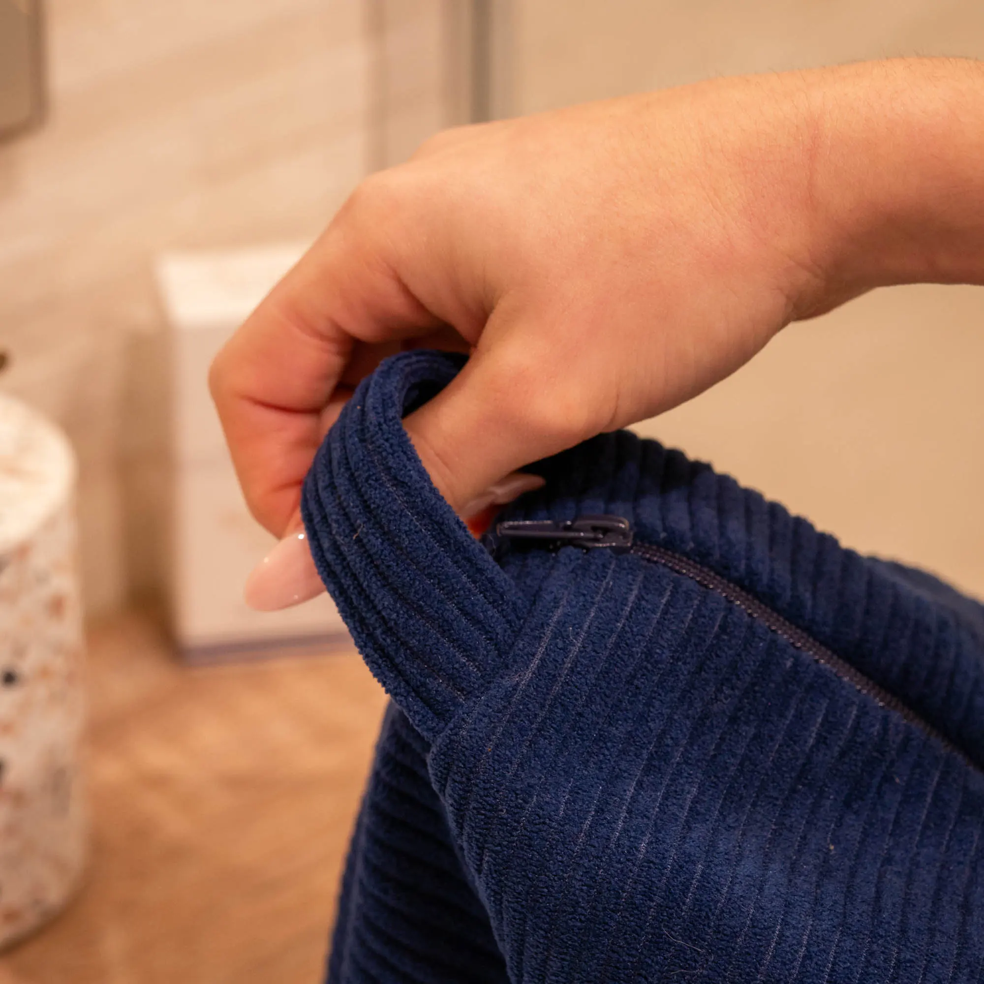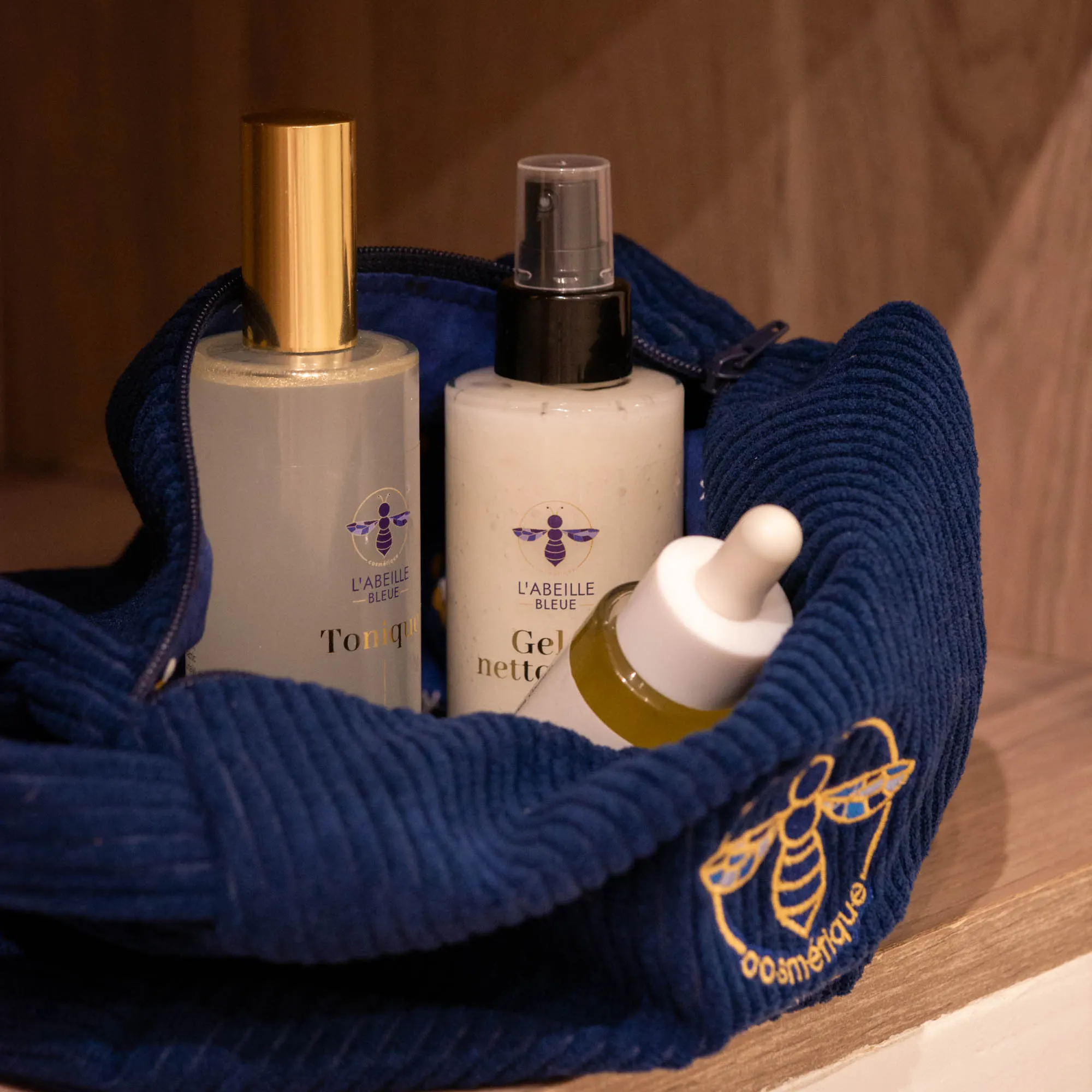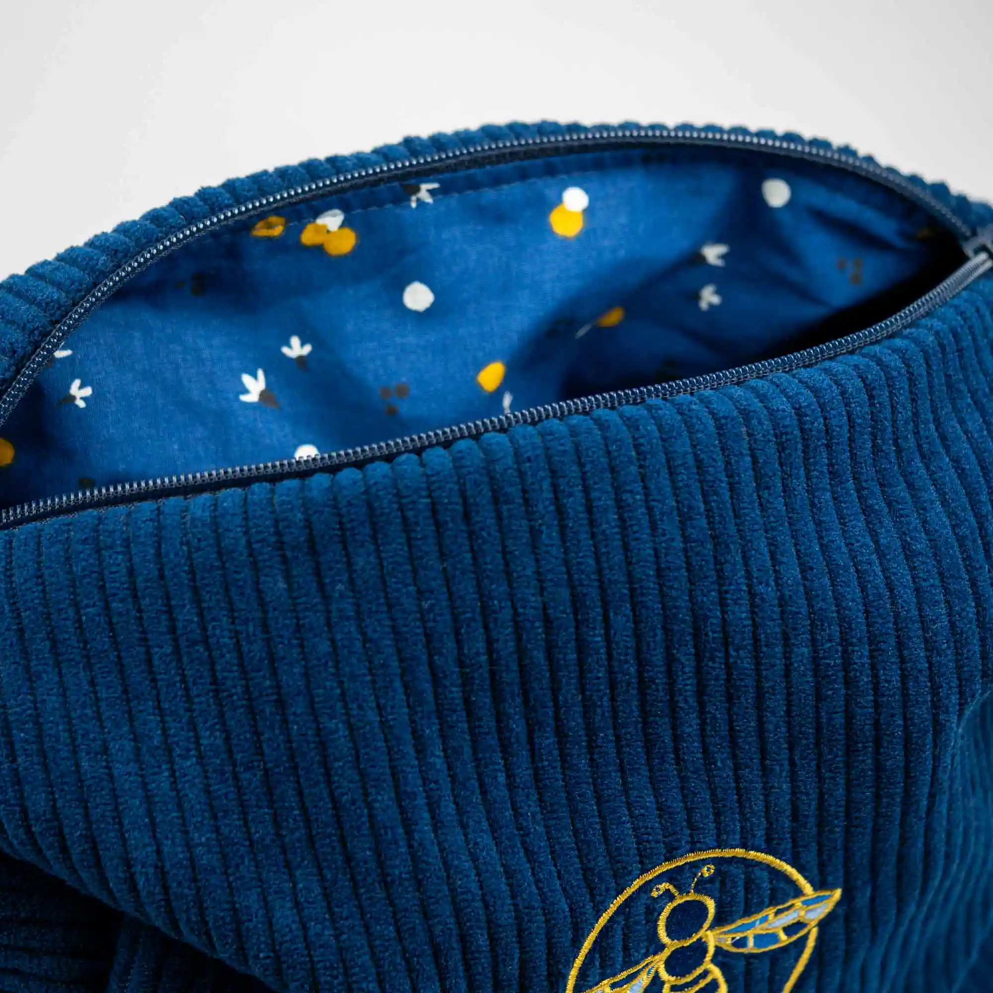Une trousse de toilette artisanale, confectionnée à la main dans un velours côtelé bleu marine, alliant qualité, élégance et et praticité.